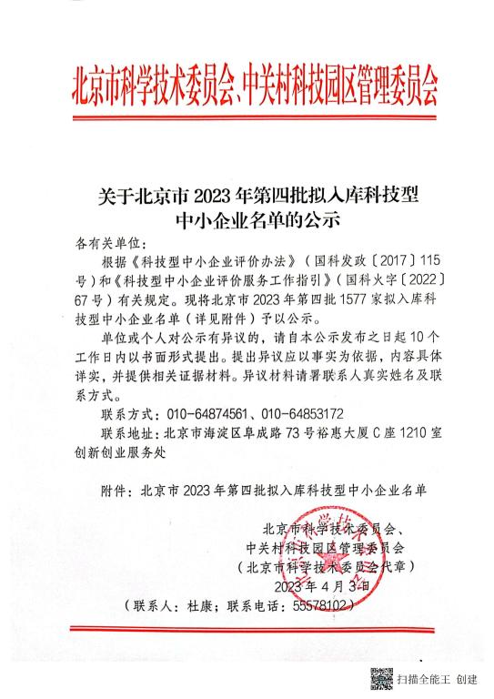 北京市2023年第4批擬入庫科技型中小企業(yè)名單公示