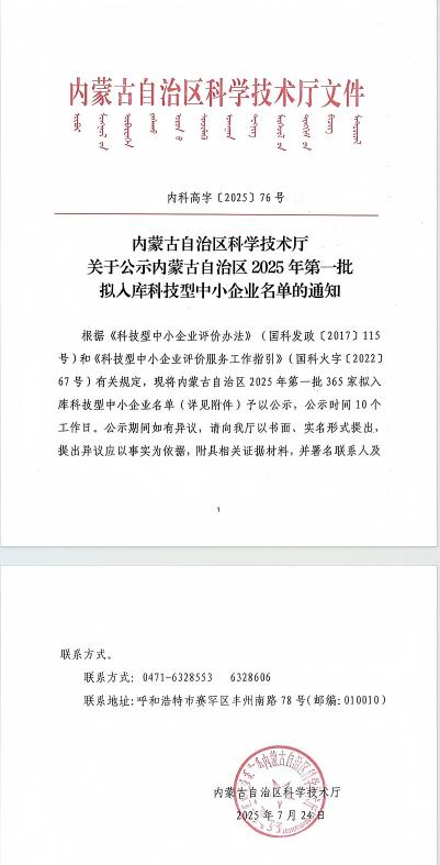 內(nèi)蒙古自治區(qū)2025年第1批擬入庫科技型中小企業(yè)名單公示