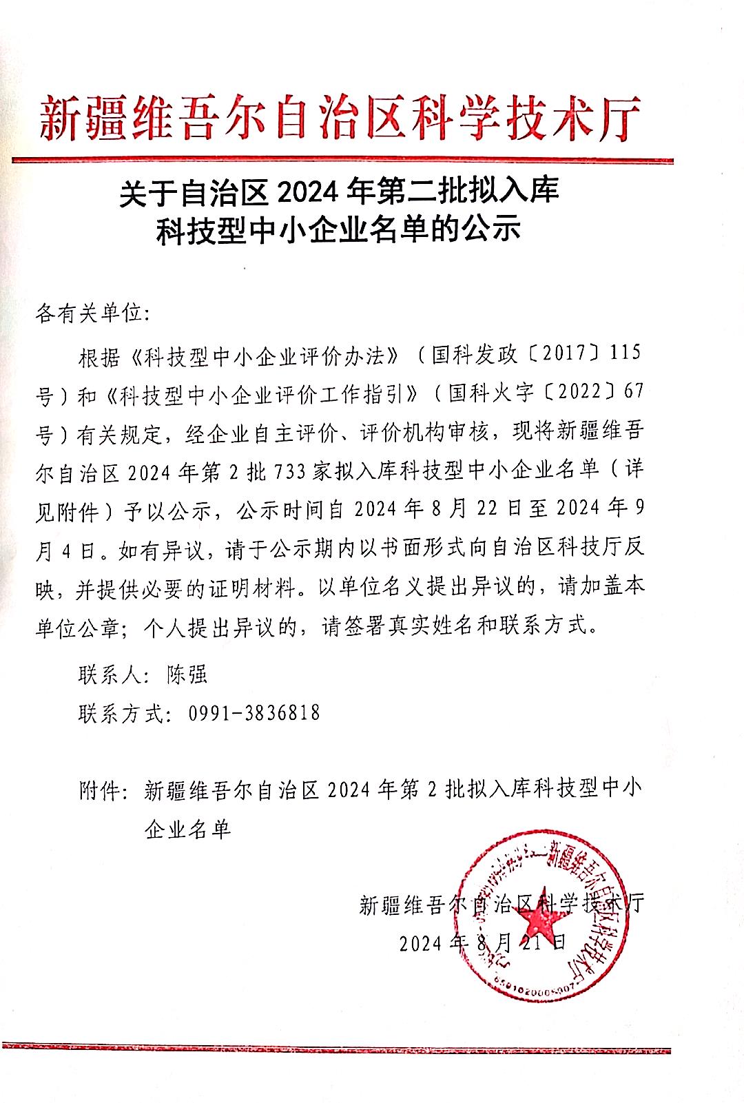 新疆維吾爾自治區(qū)2024年第2批擬入庫科技型中小企業(yè)名單公示